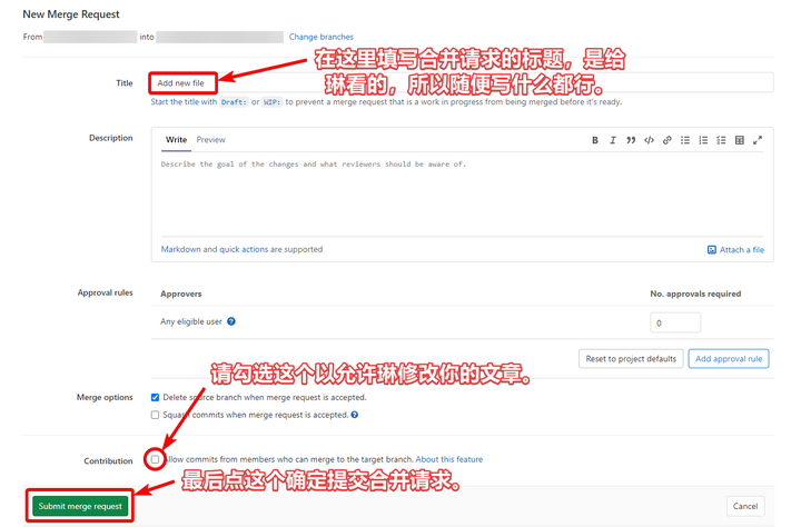 这之后,你需要开启一个合并请求,即请求琳将你编写的文章加入到《可穿戴科技》中。