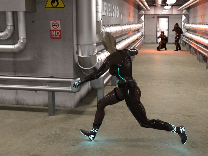 两名不起眼的小角色,走在废弃工厂的走廊中还推着一只像是铁棺材一样的东西,听他们的言语,这箱子里关押的定是那被绑架的少女,此处周围空旷无人,两名大大咧咧的守卫谈话声响彻整个走廊,躲在高处钢梁上的 Tess 自然听得一清二楚。待到二人推着箱子走远,Tess 从钢梁上跳下,借助战衣特制的鞋底,Tess 几乎不会发出任何脚步声,悄无声息地来到了两名守卫身后,行云流水地解决掉他们。