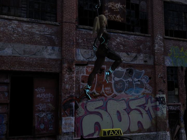 “老样子,走屋顶。”谈话间 Tess 已经下了车,她向高处射出一道绳索,固定好以后转头对小 A 说: