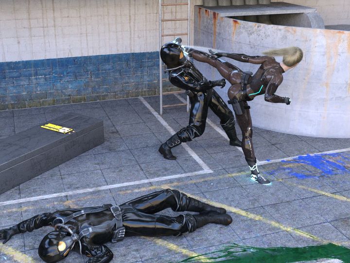 废弃大楼的楼顶,昏暗的夜色下,一名持枪守卫正无聊地打着哈欠。恍惚间,一条穿着紧身衣的纤细手臂已经悄无声息地从他脖子后方伸出。